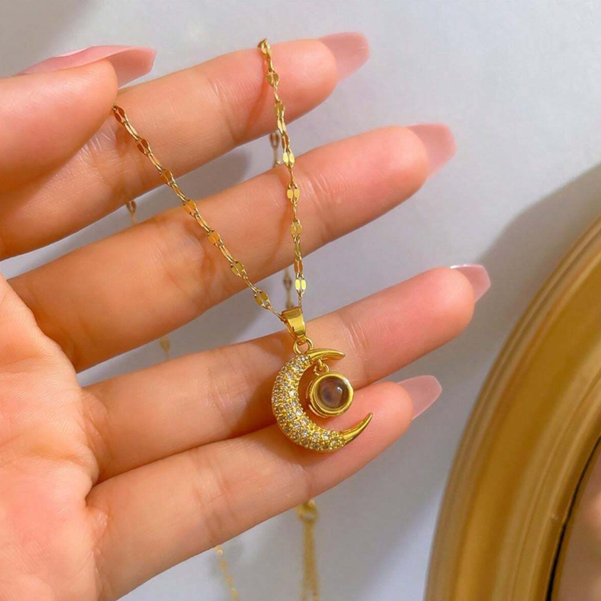 Un hermoso colgante en forma de luna mágica 🌙, con el mensaje «Te Amo» grabado en 100 idiomas diferentes 🌍💞. ¡Romántico, elegante y único!